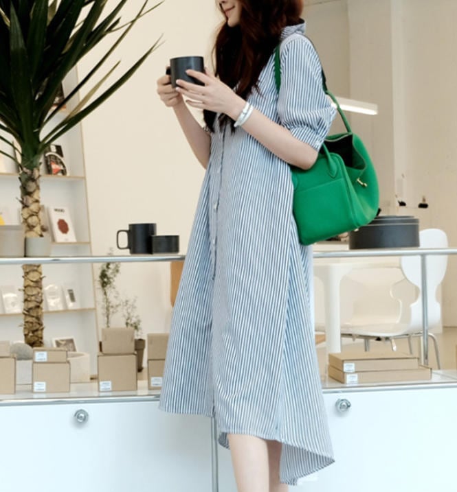 【送料無料】シャツワンピ―ス 春 ロング 長袖 大きいサイズ ストライプ 体型カバー ゆったり 大人 きれいめ カジュアル ベーシック シンプル 30代 40代 ブルー OP-040R