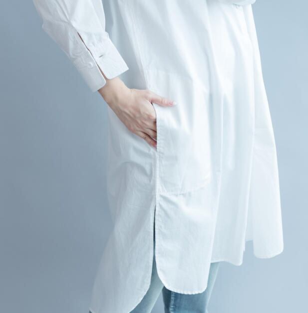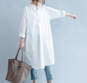 【送料無料】シャツワンピ―ス 春 ロング 長袖 大きいサイズ ノーカラー 体型カバー ゆったり 大人 きれいめ カジュアル ベーシック シンプル 30代 40代 ホワイト OP-044R