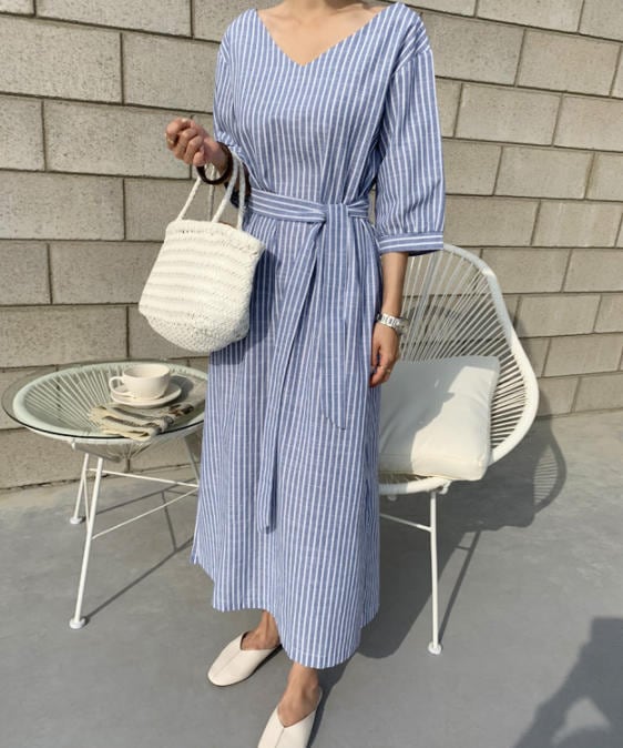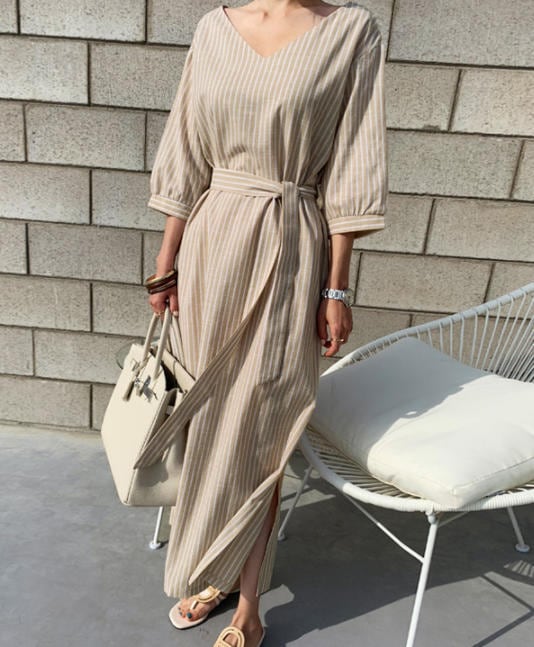 Vネックですっきりと見せてくれるストライプワンピース♪