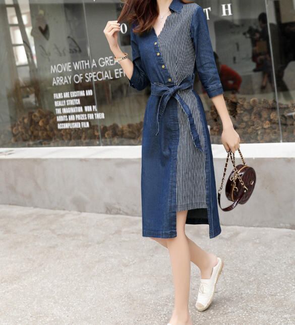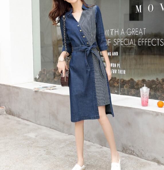 【送料無料】シャツワンピ―ス 春 ロング 大きいサイズ デニム ストライプ ウエストリボン 半袖 体型カバー ゆったり 大人 きれいめ カジュアル ベーシック シンプル 30代 40代 ブルー OP-083R