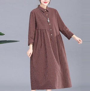 【送料無料】シャツワンピ―ス 春 ロング 大きいサイズ ストライプ 半袖 体型カバー ゆったり 大人 きれいめ カジュアル ベーシック シンプル 30代 40代 レッド ブラウン OP-090R