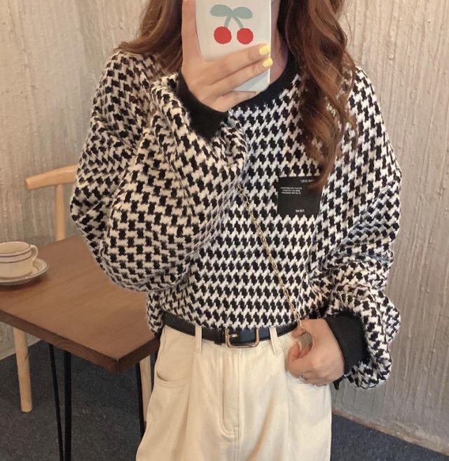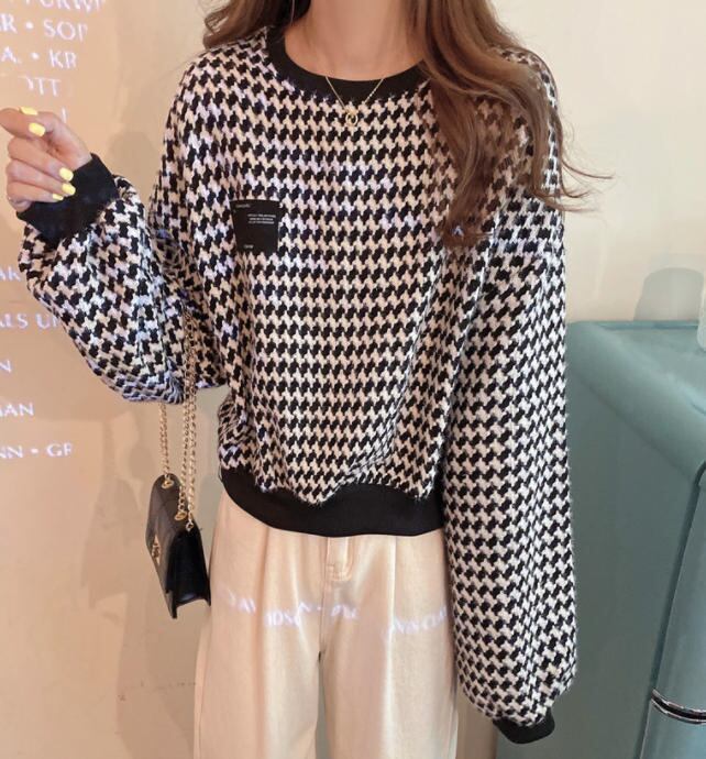 【送料無料】スウェット トップス 長袖 千鳥格子 ビッグシルエット ゆったり 可愛い レトロ きれいめ おしゃれ 30代 40代 ブラック ブラウン TP-021B