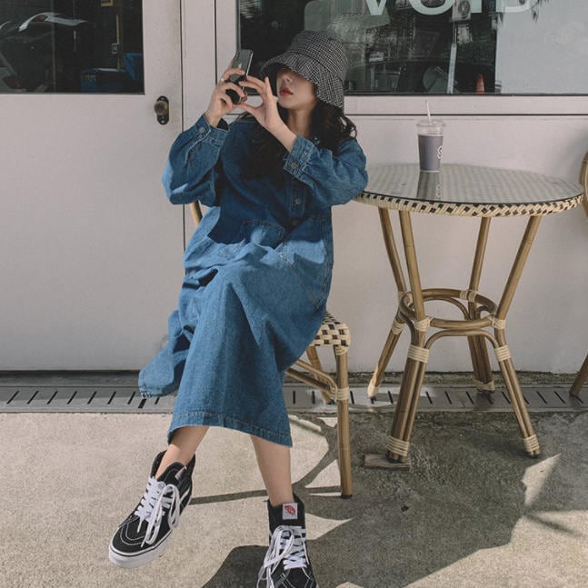 【送料無料】ワンピース 長袖 フレア 体型カバー 無地 カジュアル シンプル 大人 ベーシック 30代 40代 ブルー OP-113B