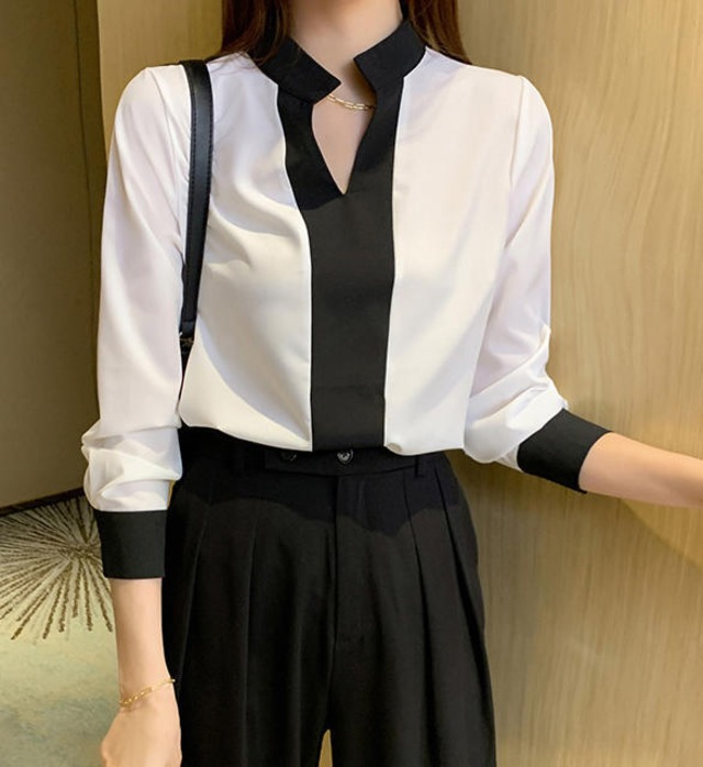 【送料無料】ブラウス オフィス フォーマル トップス Vネック バイカラー とろみ 大人 上品 シンプル 30代 40代 ホワイト TP-040R
