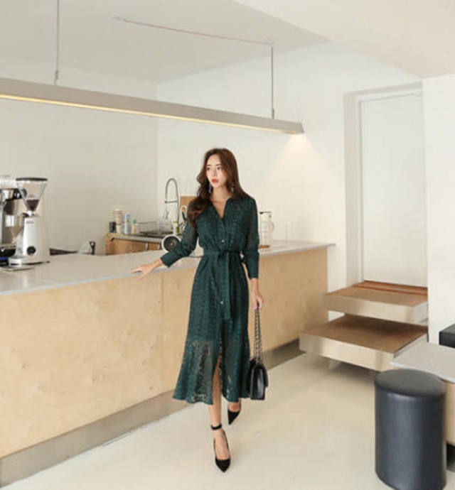 【送料無料】ワンピース きれいめ 長袖 レース ロング フレア シャツ風 きれいめ 上品 大人 30代 40代 ホワイト グリーン OP-146R