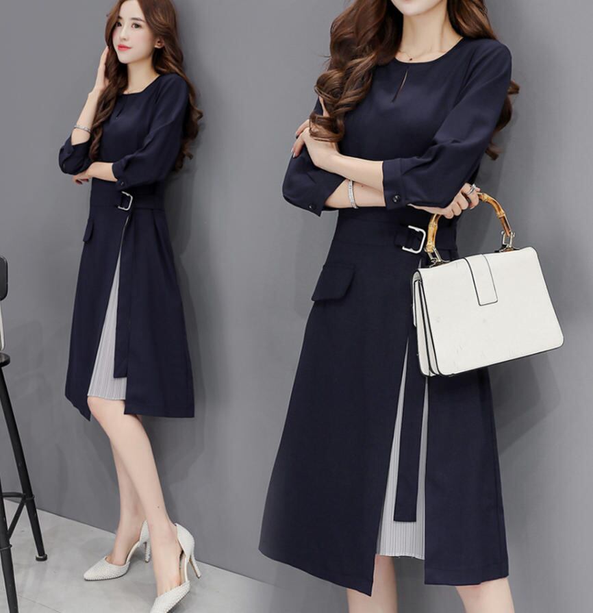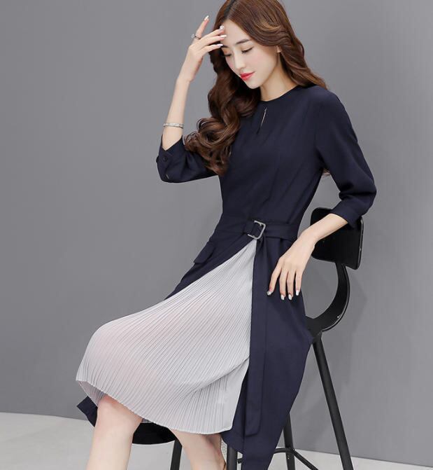 【送料無料】ワンピース きれいめ 長袖 膝丈 ハイウエスト フレア Aライン エレガント 上品 大人 30代 40代 ネイビー OP-150R
