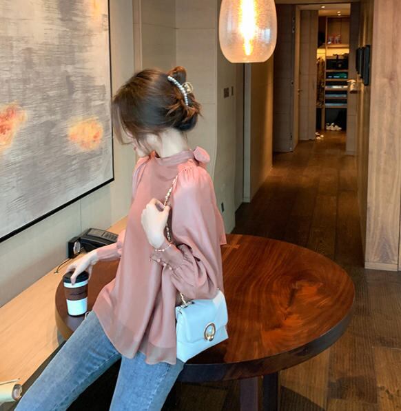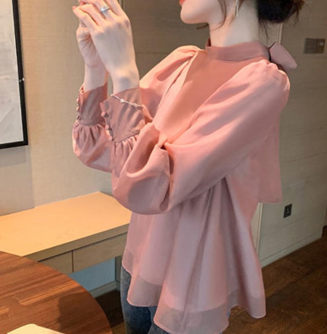 【送料無料】シャツ ブラウス トップス 長袖 リボン ボリューム袖 ゆったり 無地 シンプル ベーシック カジュアル 大人 30代 40代 ホワイト ピンク TP-075R