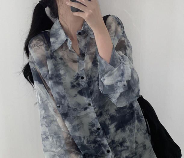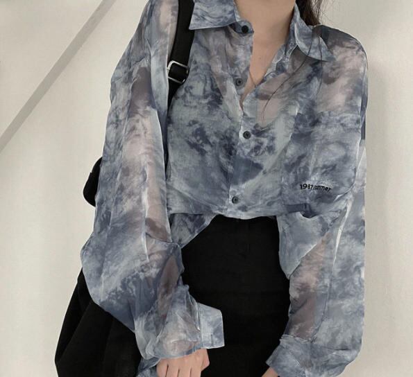 【送料無料】シャツ ブラウス トップス 長袖 タイダイ シースルー 透け感 ゆったり 無地 シンプル ベーシック カジュアル 大人 30代 40代 ブルー TP-076R