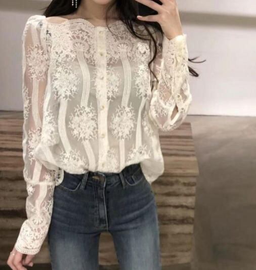 【送料無料】ブラウス トップス 総レース スカラップ シースルー 上品 きれいめ 大人 レトロ 20代 30代 ホワイト ブラック TP-093R