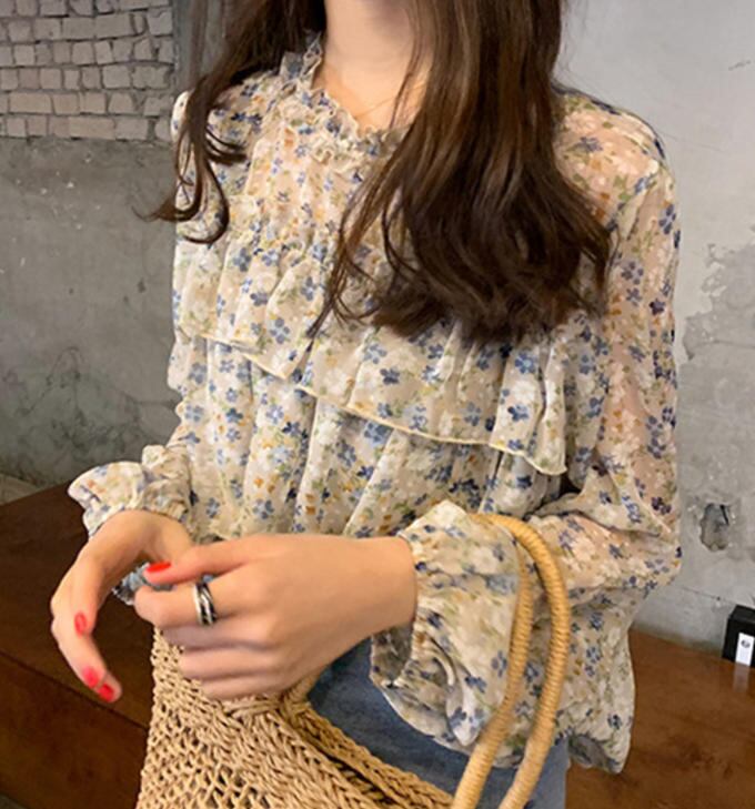 【送料無料】ブラウス トップス 花柄 シフォン フリル 透け感 きれいめ 上品 レトロ 大人 おしゃれ 30代 40代 ベージュ TP-094R
