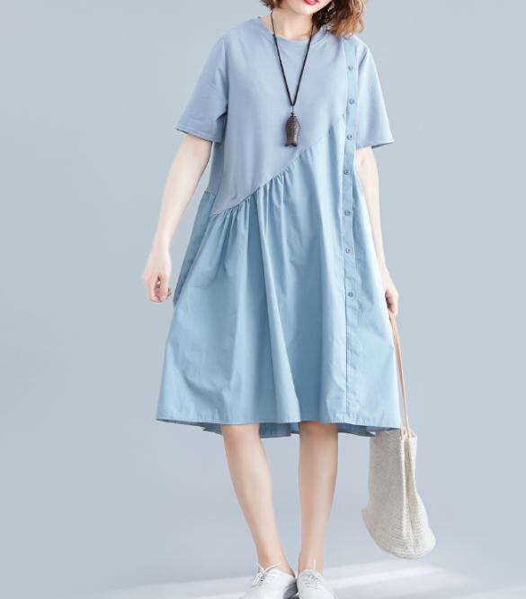 【送料無料】ワンピース 春 きれいめ 半袖 夏 ひざ丈 大きいサイズ ゆったり 無地 大人 きれいめ カジュアル シンプル 30代 40代 ブルー OP-182R