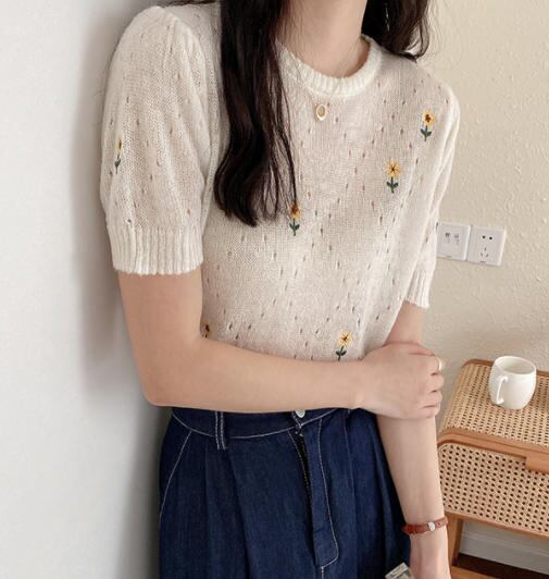 【送料無料】サマーニット 半袖 花柄 透け感 カジュアル きれいめ 大人 フェミニン 上品 30代 40代 ホワイト ブルー イエロー グリーン TP-104R