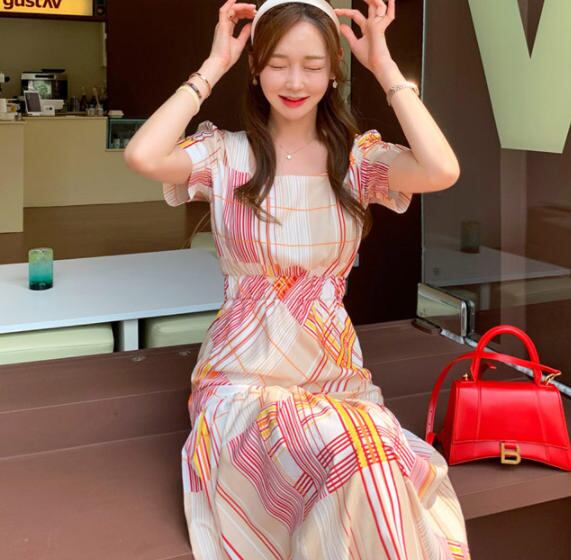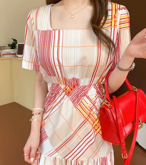 【送料無料】ワンピース 夏 きれいめ 半袖 スクエアネック チェック ハイウエスト フレア 大人 おしゃれ 30代 40代 ホワイト OP-191R