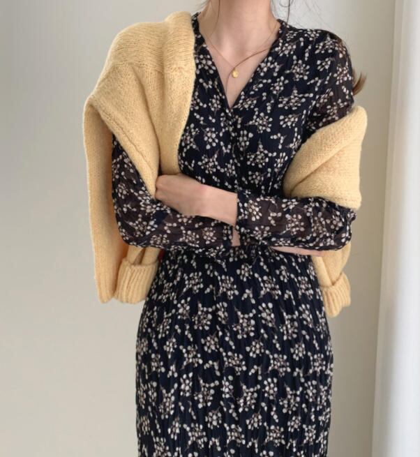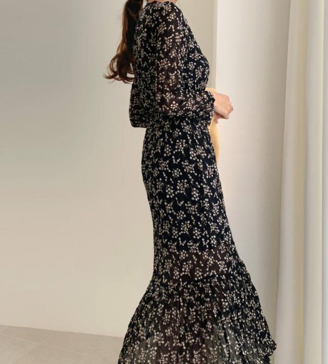 【送料無料】ワンピース 夏 きれいめ ロング 花柄 ワッシャー Vネック レトロ カジュアル 上品 30代 オレンジ ブラック OP-192R