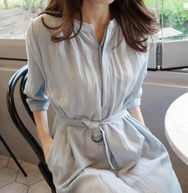【送料無料】ワンピース 夏 きれいめ 膝丈 ノーカラー ハイウエスト 無地 シンプル カジュアル 大人 ブルー 30代 OP-196R