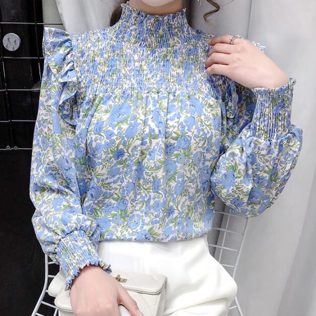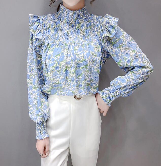 【送料無料】ブラウス シャツ トップス 大きいサイズ 長袖 花柄 ハイネック きれいめ 上品 大人 可愛い 30代 40代 ブルー ピンク TP-112R