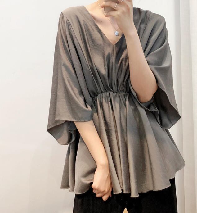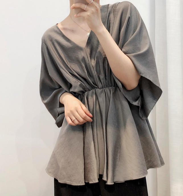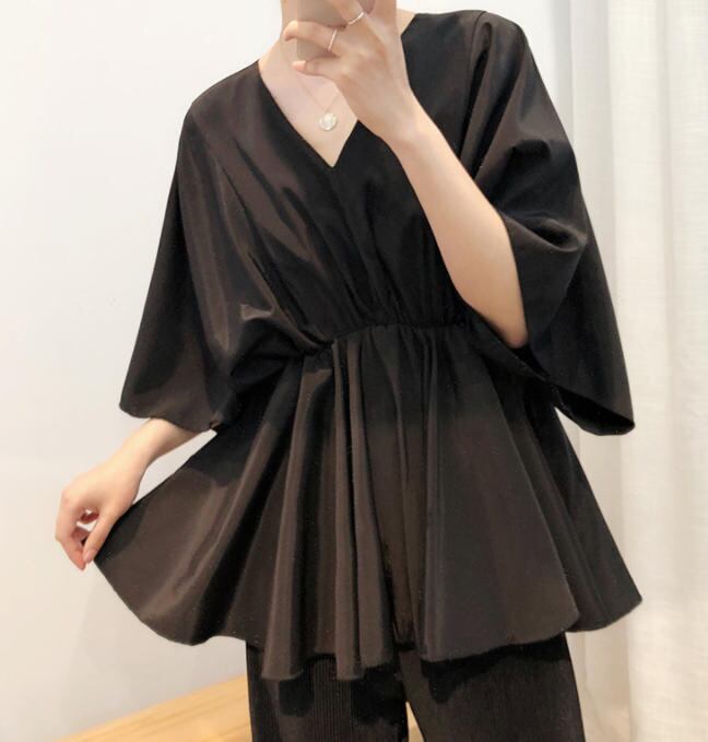 【送料無料】ブラウス トップス ペプラム フレア Vネック 無地 カジュアル きれいめ 大人 シンプル 30代 40代 ホワイト ブラック カーキ TP-134R