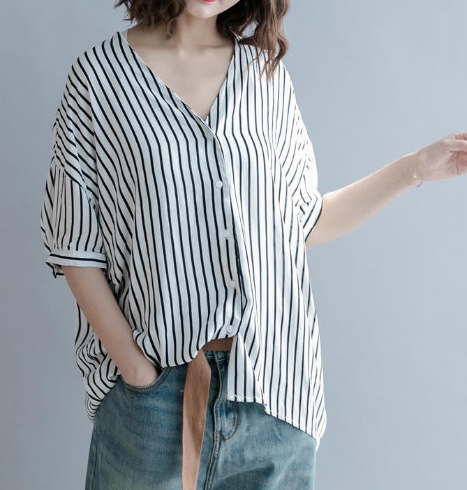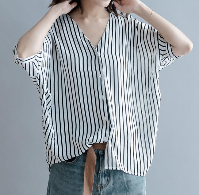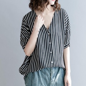 【送料無料】シャツ ブラウス トップス ストライプ 半袖 Vネック ゆったり カジュアル シンプル 大人 30代 40代 ブラック ホワイト TP-136R