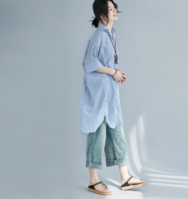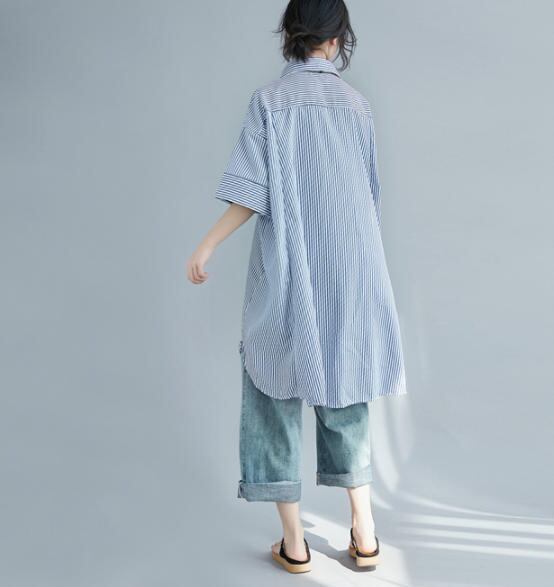 【送料無料】シャツ ブラウス トップス ストライプ 五分袖 ゆったり カジュアル シンプル おしゃれ 30代 40代 ブルー ブラック TP-147R
