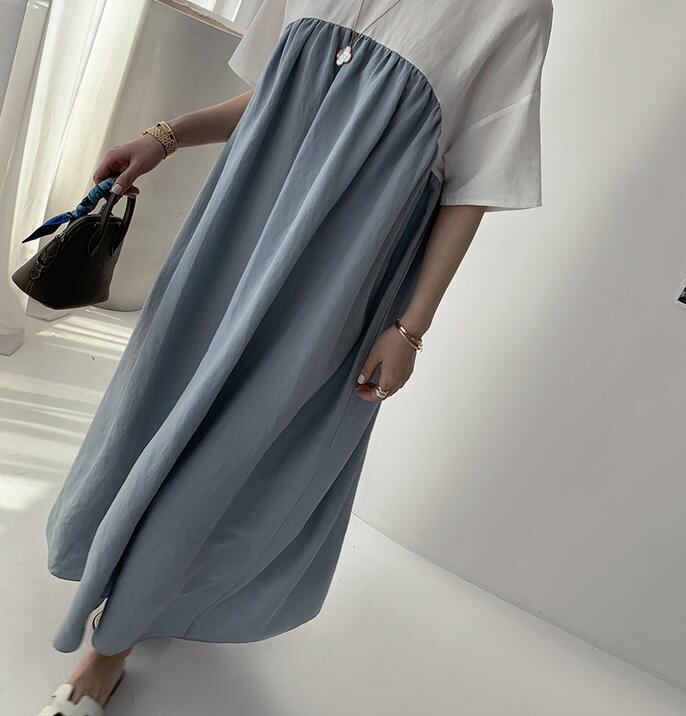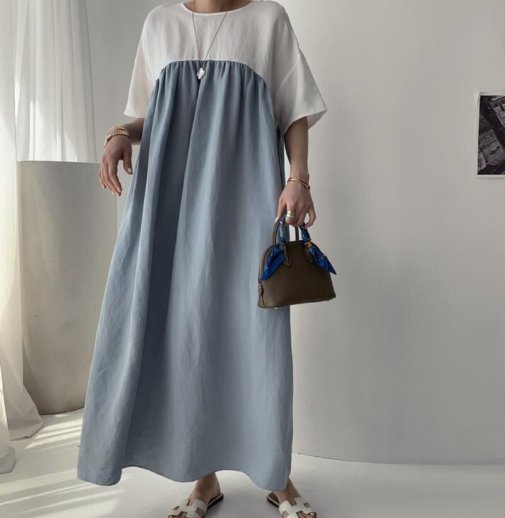 【送料無料】ワンピース 夏 ゆったり バイカラー リボン ルーズ 体型カバー 無地 カジュアル 大人 きれいめ 30代 40代 ブルー ブラック OP-220R