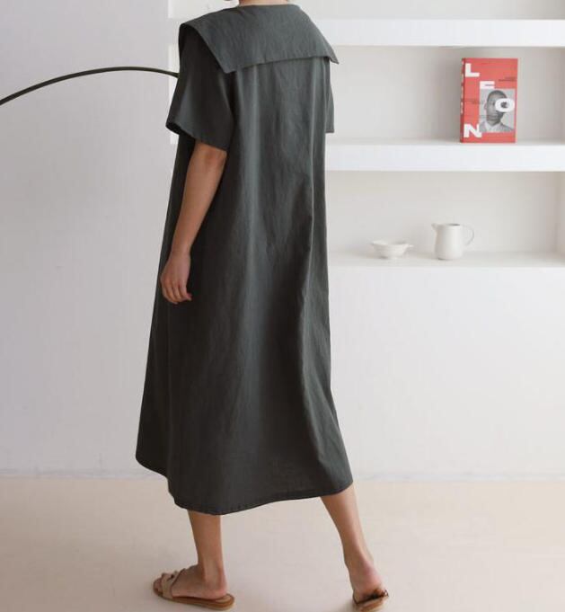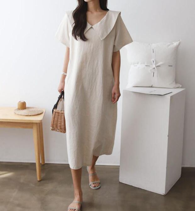 【送料無料】ワンピース 夏 ゆったり 大きめ襟 Vネック ゆったり 無地 おしゃれ カジュアル シンプル 大人 30代 40代 カーキ ベージュ グレー OP-225