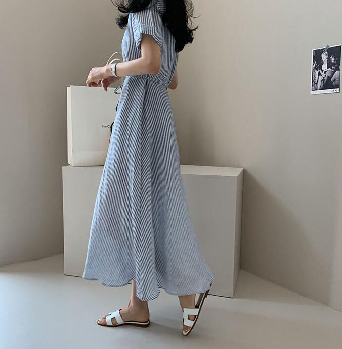 【送料無料】シャツワンピース 半袖 ロング 夏 ストライプ ハイウエスト フレア 大人 カジュアル シンプル おしゃれ 30代 40代 ブルー OP-227