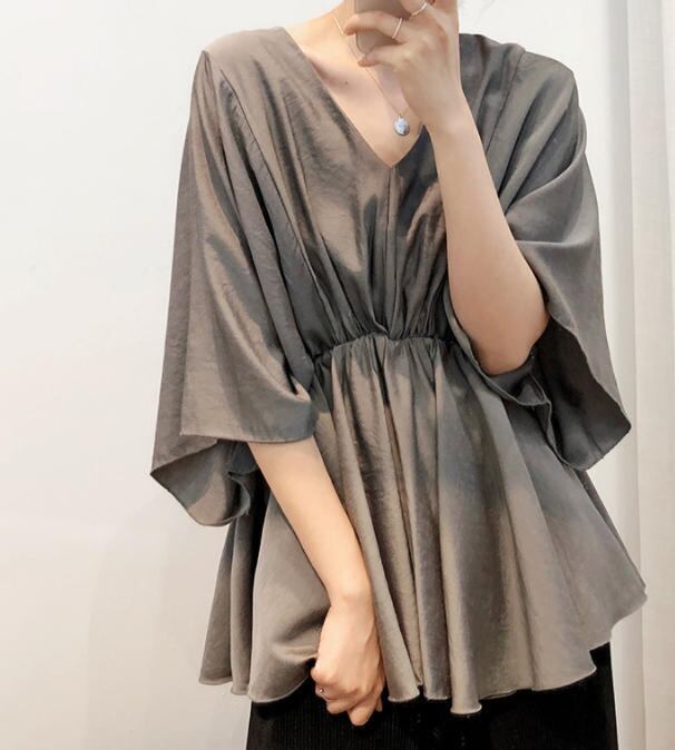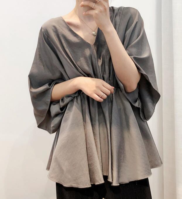【送料無料】ブラウス トップス Vネック ペプラム フレア カジュアル シンプル 大人可愛い おしゃれ 30代 40代 グレー ブラック ホワイト TP-159