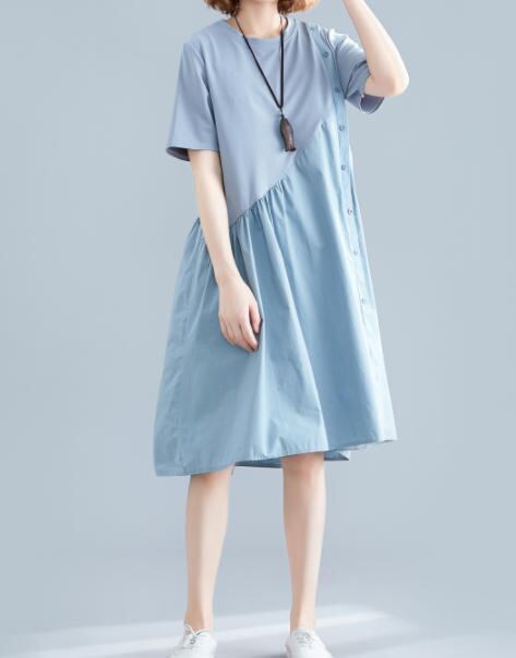 【送料無料】ワンピース 夏 膝丈 大きいサイズ フレア ゆったり 体型カバー カジュアル シンプル おしゃれ 30代 40代 ブルー OP-242R
