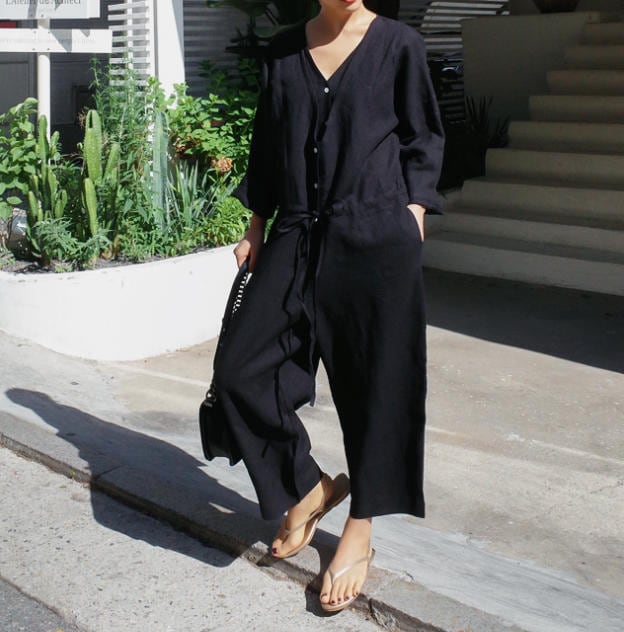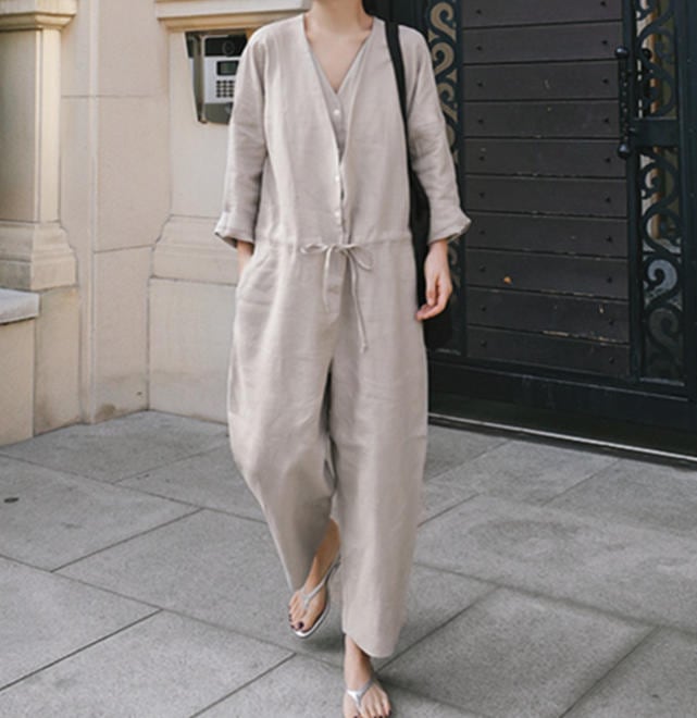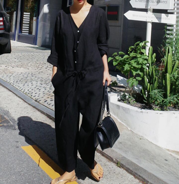 【送料無料】オールインワン ワイドパンツ Vネック 体型カバー 無地 ゆったり カジュアル シンプル 大人 30代 40代 ベージュ ブラック OI-013R