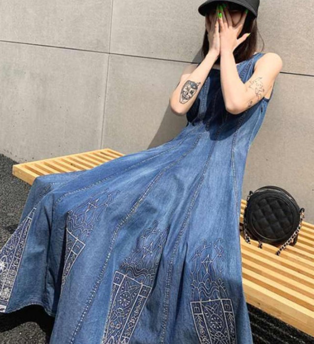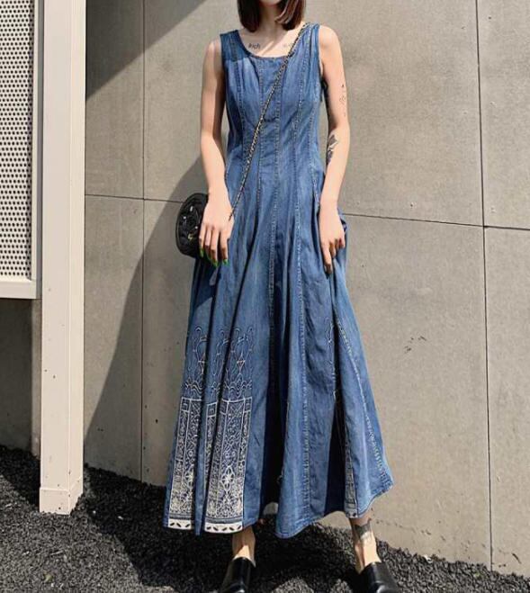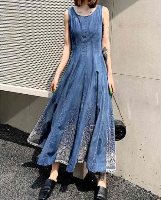 【送料無料】ワンピース 夏 ロング 大きいサイズ ノースリーブ デニム ハイウエスト フレア カジュアル きれいめ 大人 30代 40代 ブルー OP-245R