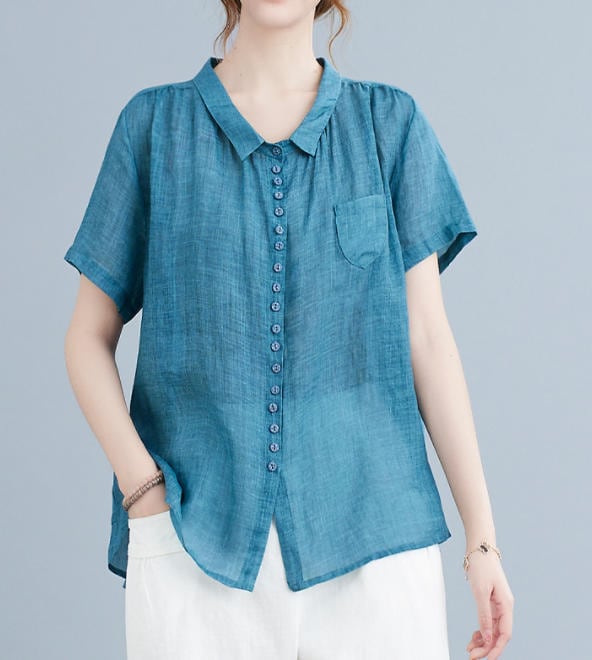 【送料無料】リネンシャツ ブラウス シャツ トップス 大きいサイズ リネン ゆったり 無地 カジュアル シンプル 大人 きれいめ ベーシック 30代 40代 ブルー TP-269R