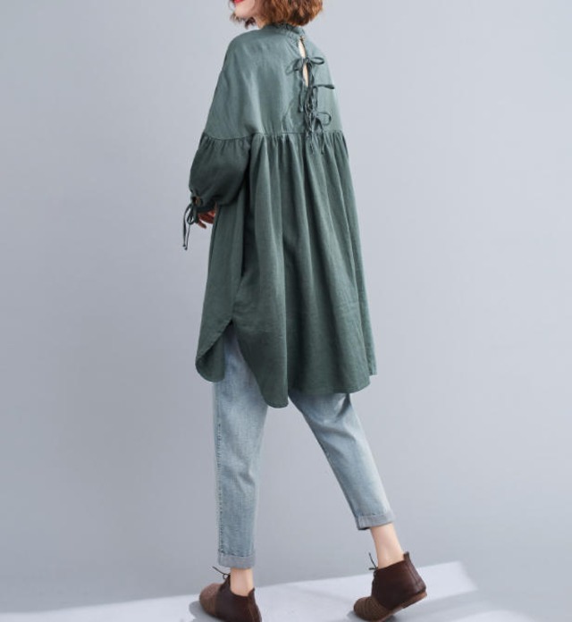 【送料無料】リネンシャツ ブラウス シャツ トップス リネン リボン ゆったり 無地 カジュアル シンプル 大人 きれいめ ベーシック 30代 40代 グリーン TP-289R