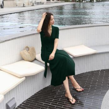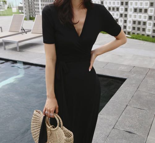 【送料無料】ワンピース きれいめ ロング Vネック 半袖 無地 フレア カジュアル シンプル 大人 可愛い ベーシック 30代 40代 ブラック グリーン OP-259R
