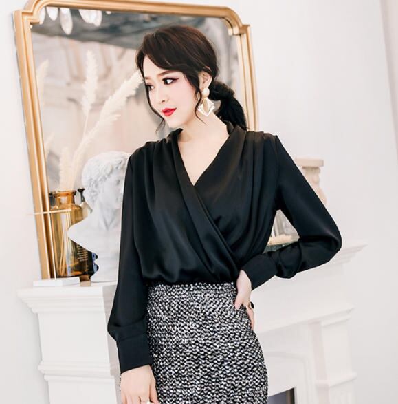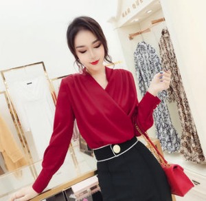 【送料無料】ブラウス トップス ドット Vネック 長袖 ゆったり きれいめ 上品 大人 無地 シンプル 30代 40代 ホワイト ブラック レッド TP-309R