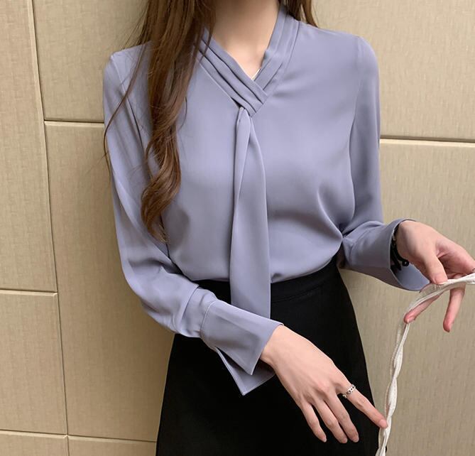 【送料無料】ブラウス トップス 大きいサイズ ボウタイ 長袖 きれいめ 上品 大人 無地 シンプル 30代 40代 ブルー TP-311R