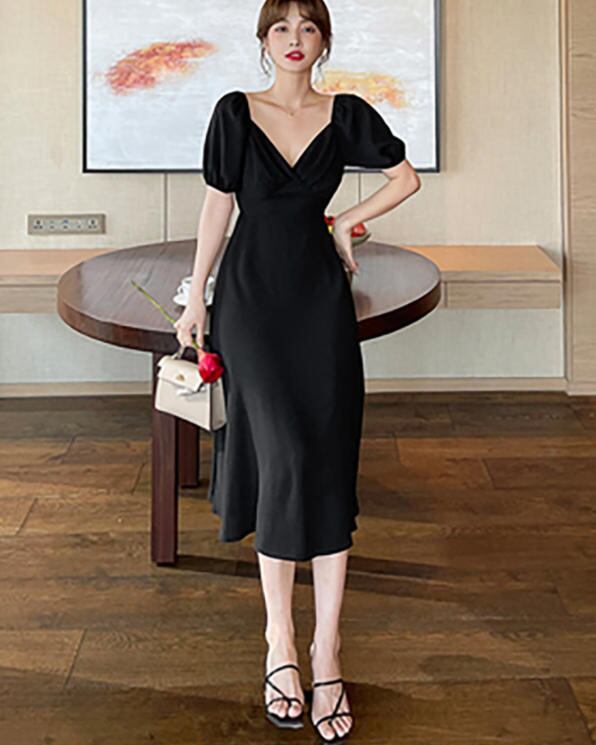 【送料無料】ワンピース きれいめ ロング 膝丈 長袖 パーティードレス Vネック ハイウエスト 上品 大人 可愛い おしゃれ 30代 40代 ブラック レッド OP-272R