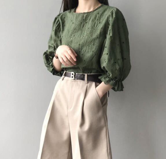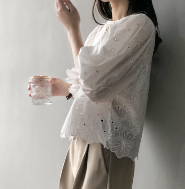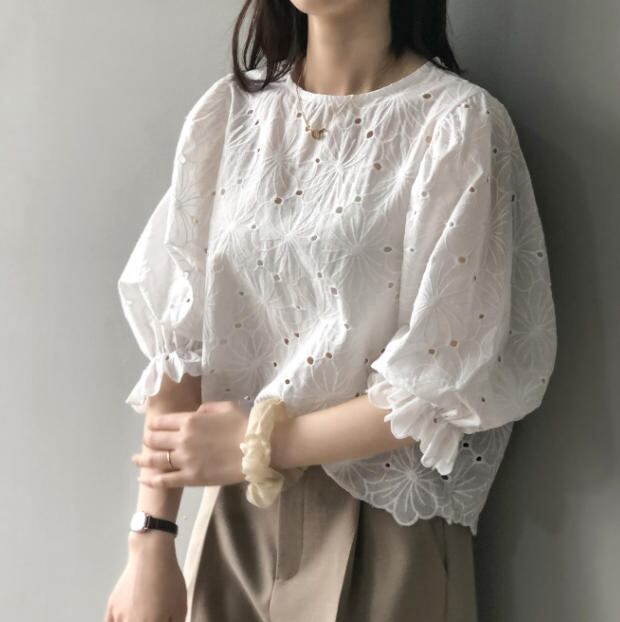 【送料無料】ブラウス トップス きれいめ 半袖 パンチングレース おしゃれ 上品 大人 無地 可愛い 30代 40代 ホワイト グリーン TP-326R