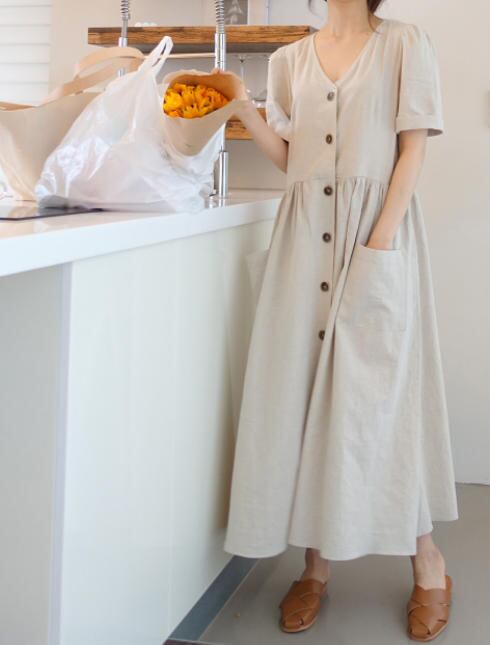 【送料無料】ワンピース きれいめ ロング Vネック 前開き ゆったり 半袖 無地 フレア カジュアル シンプル 大人 可愛い ベーシック 30代 40代 ベージュ ブラック OP-275R