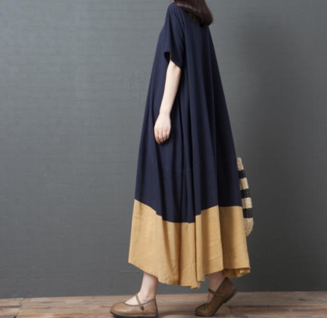 【送料無料】ワンピース きれいめ ロング 大きいサイズ 半袖 切り替え ルーズ ゆったり 半袖 無地 フレア カジュアル シンプル 大人 可愛い ベーシック 30代 40代 ネイビー OP-285R