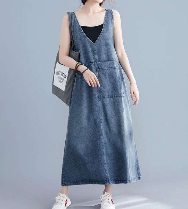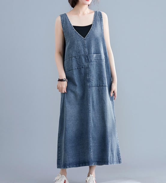 【送料無料】ワンピース デニムワンピース ノースリーブ ロング 大きいサイズ ルーズ ゆったり 半袖 無地 フレア カジュアル シンプル 大人 可愛い ベーシック 30代 40代 ブルー OP-322R