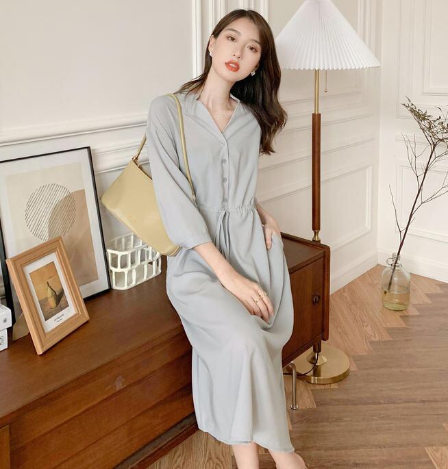 【送料無料】ワンピース 秋 きれいめ ロング 長袖 ハイウエスト フレア 上品 シンプル ベーシック 大人 無地 30代 40代 グリーン OP-329
