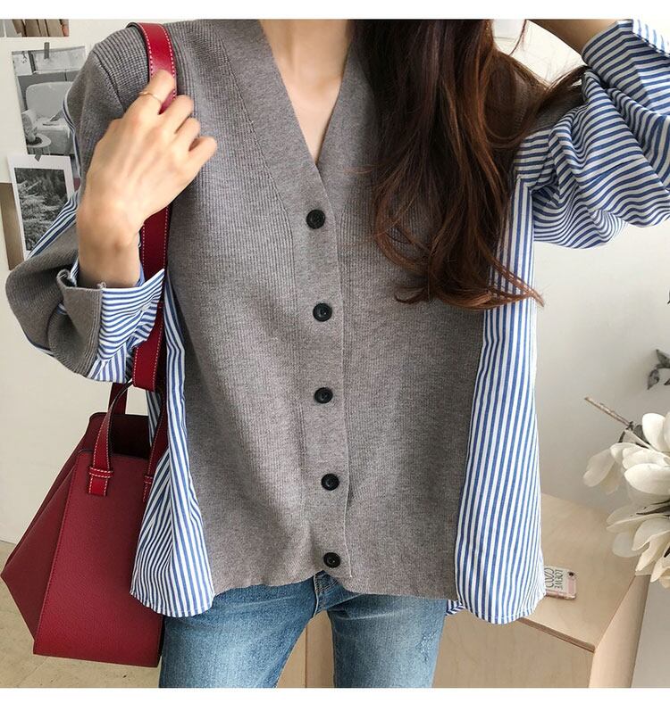 無地とストライプの切り替えがおしゃれなカーディガン。
