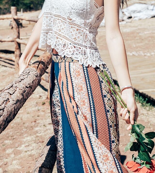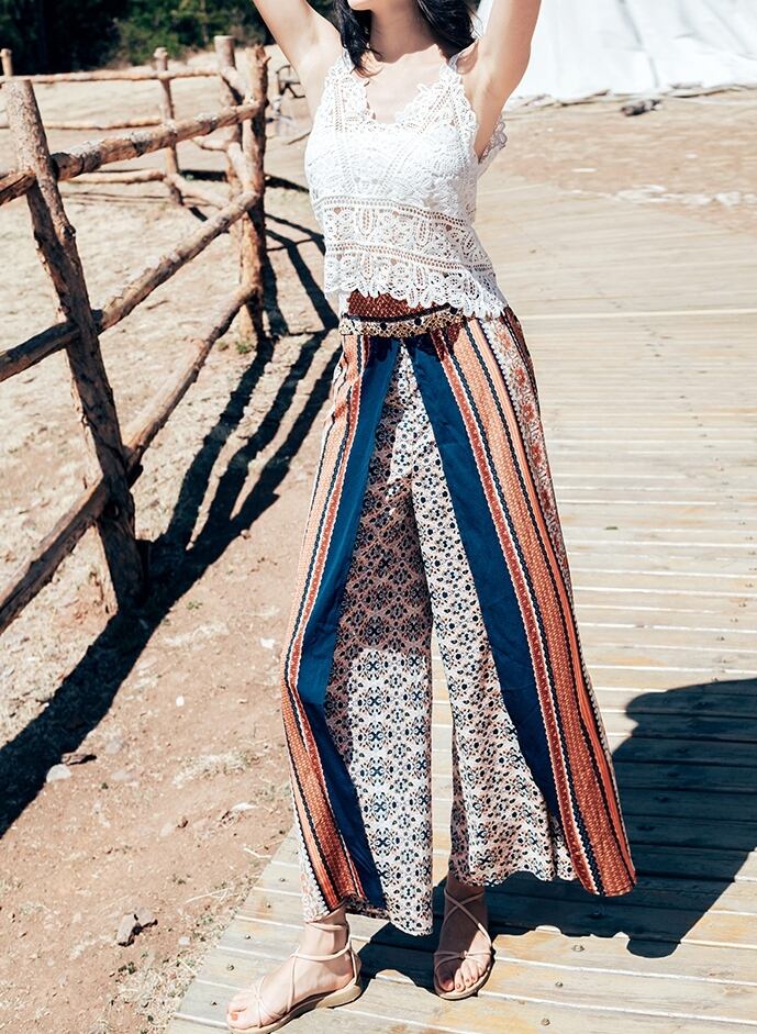 鮮やかなエスニックプリントのワイドパンツです。