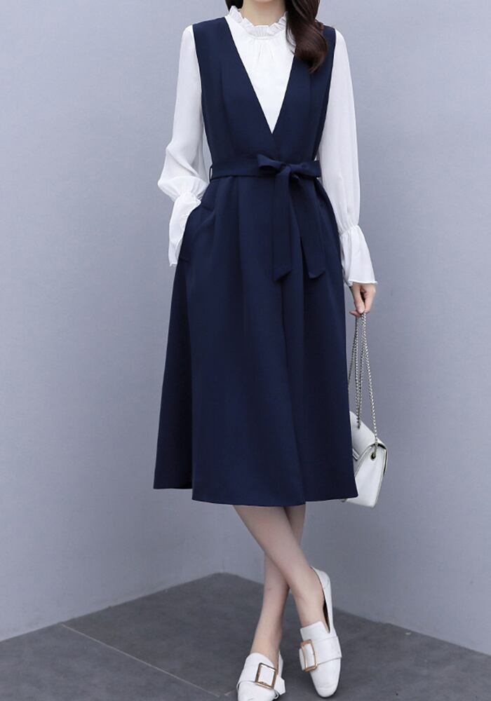 ワンピース ミディアム丈 フレア Vネック 長袖ブラウス トランペットスリーブ ウエストリボン 無地 シンプル 秋冬 エレガント フェミニン お出かけ デート 通勤 OP-004YK