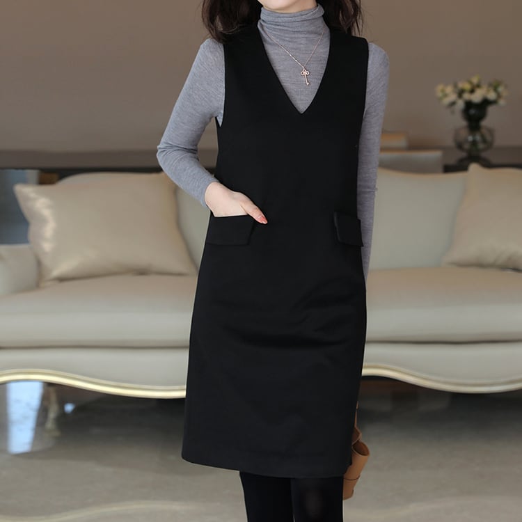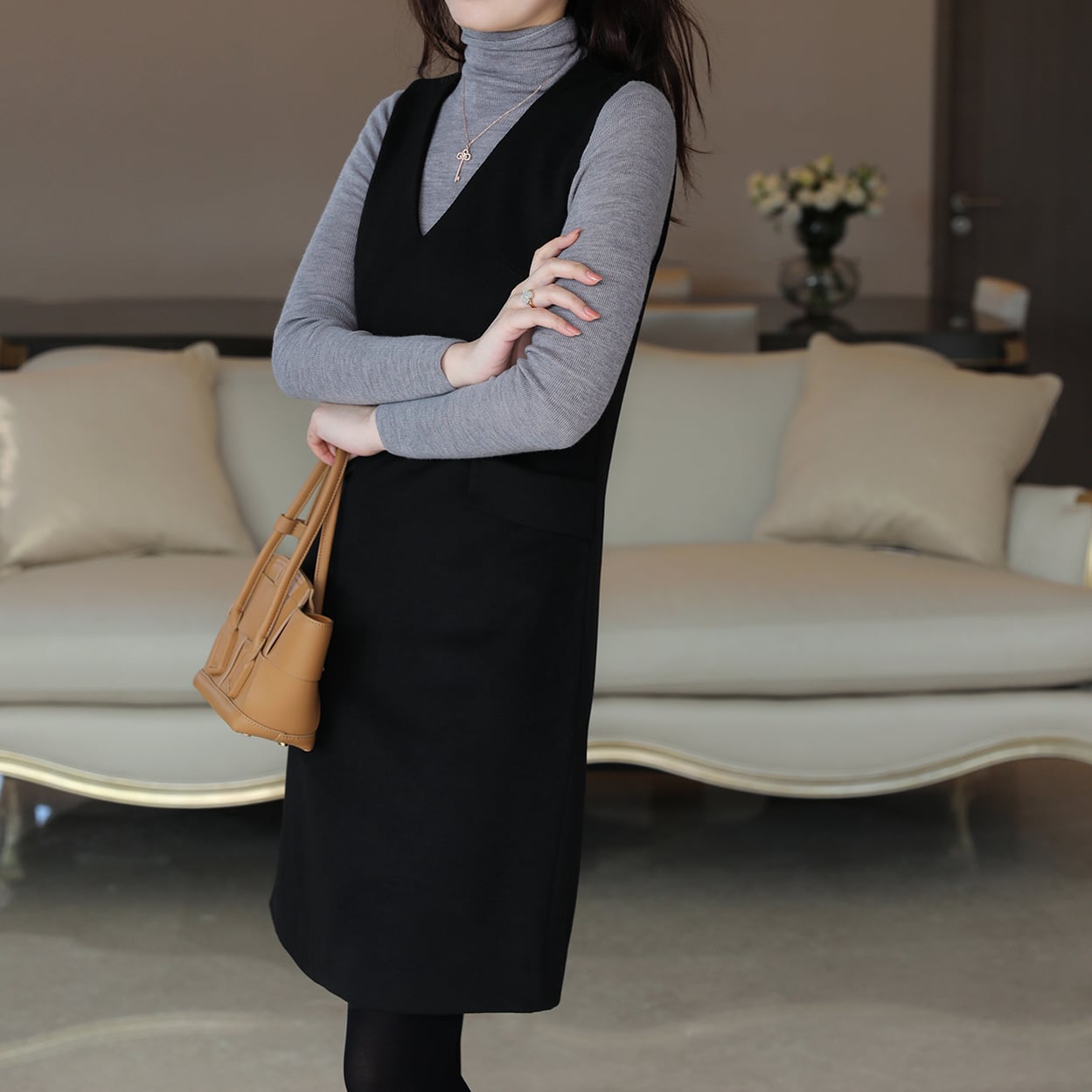 ジャンパースカート ジャンスカ Vネック ノースリーブ ショート丈 膝上 ポケット Aライン 体型カバー 秋冬 通勤 エレガント お出かけ デート AI-010YK