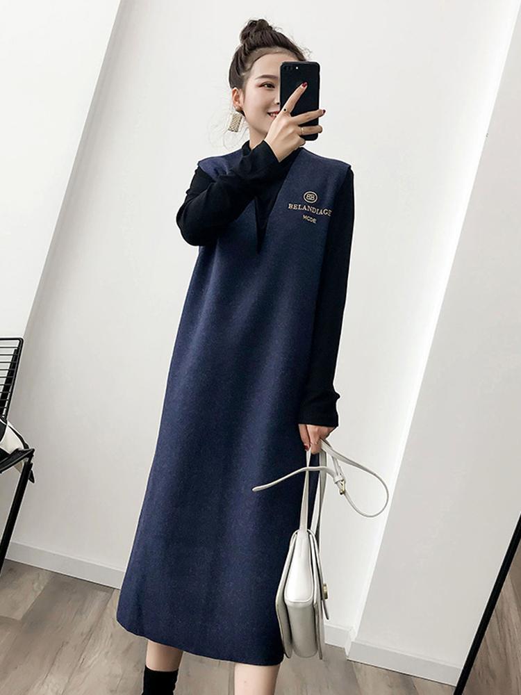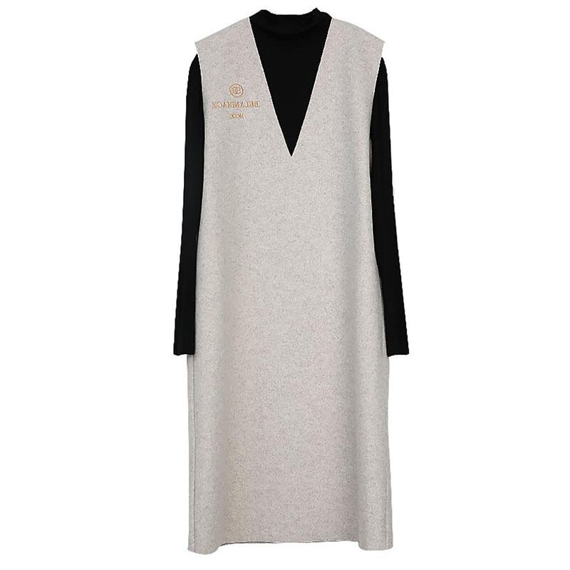 セットアップ ジャンパースカート Vネック ノースリーブ ミディアム丈 Aライン 無地 シンプル 長袖 ハイネック 体型カバー 秋冬 通勤 エレガント お出かけ デート ST-005YK
