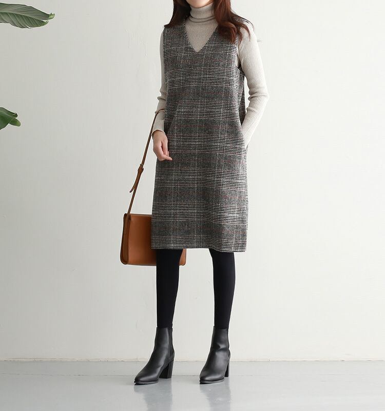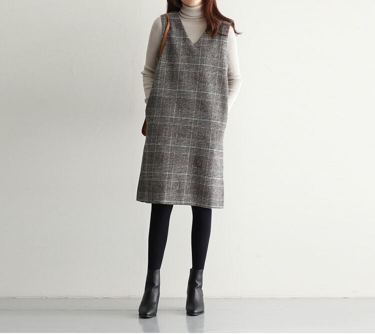 ベストスカート ウール スリム ミドル丈 千鳥格子 ノースリーブドレス Vネック ノースリーブ ストラップ ゆったりウエスト Aライン ヘッジ 秋 冬 おしゃれ 大人かわいい きれいめ ポケット OLスタイル お出かけ デート 通勤 OP-004RT