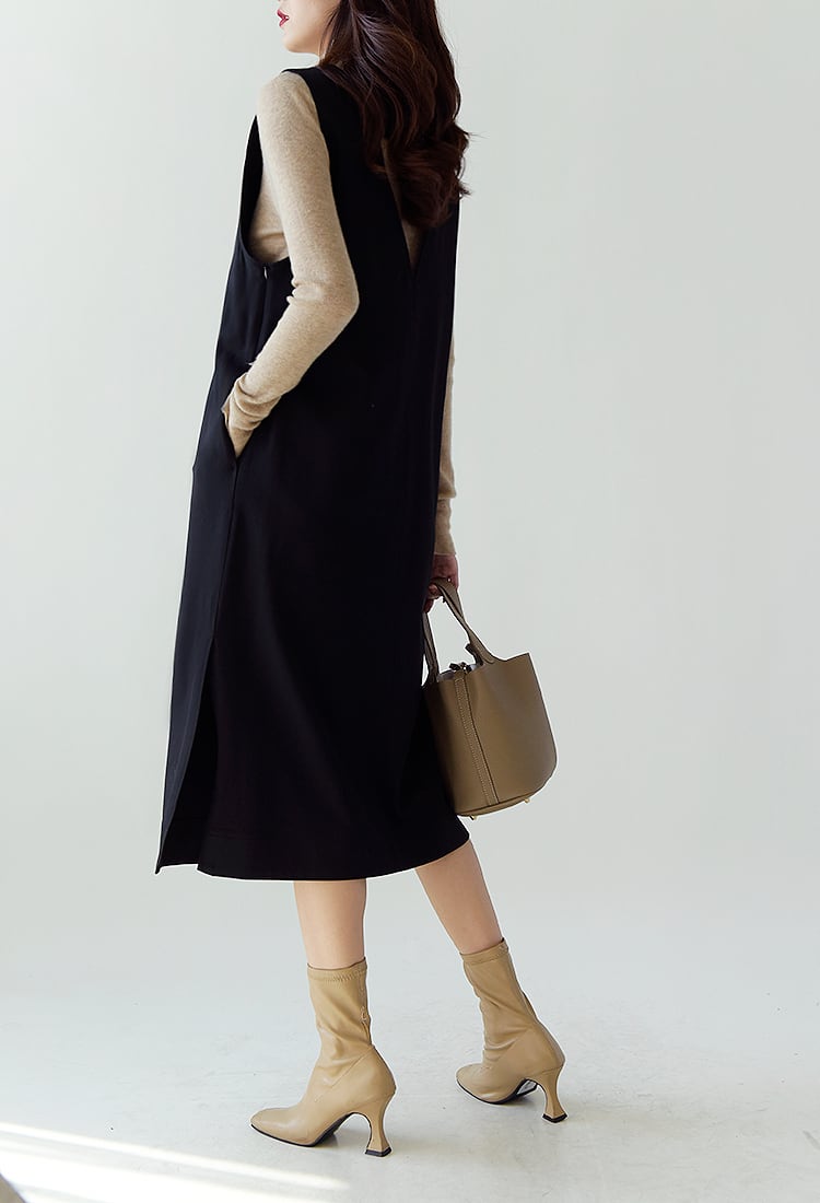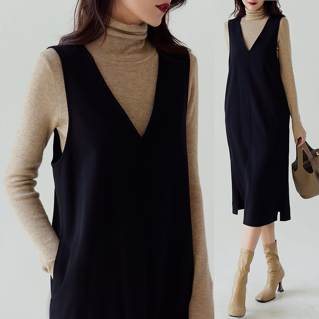 ジャンパースカート ジャンスカ Vネック ウール混 ノースリーブ サイドスリット サイドジッパー ミディアム丈 膝下 ストレート 体型カバー 無地 シンプル 通勤 お出かけ デート AI-014YK