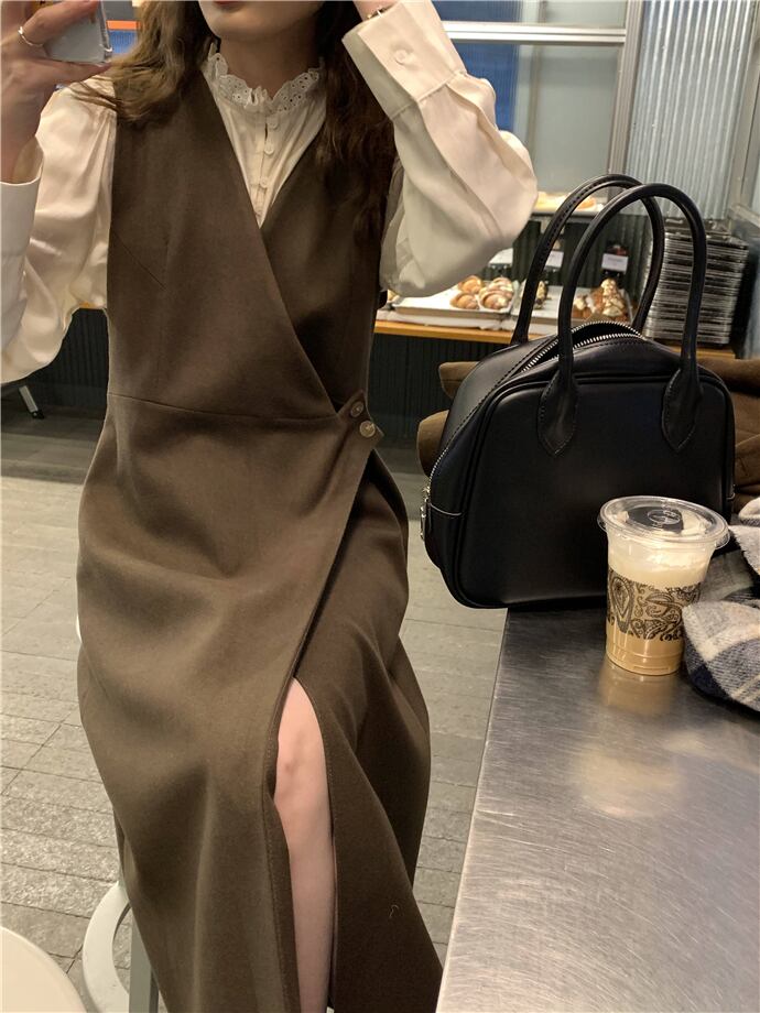 ジャンパースカート ジャンスカ Vネック ウール混 ノースリーブ ロング丈 ラップスカート Aライン 無地 シンプル フェミニン 通勤 お出かけ デート AI-017YK