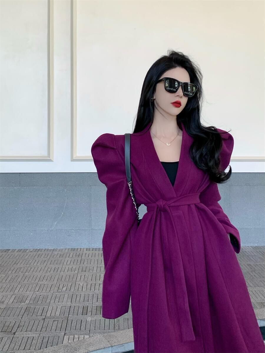 コーディガン アウター パワーショルダー ロング丈 Vネック ウエストリボン ハイウエスト Aライン エレガント 秋冬 ゆったり 体型カバー 通勤 お出かけ OU-021YK